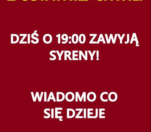Zgodnie z treścią alertu, w piątkowy wieczór, między godziną 19:00 a 21:00, mogą być słyszalne sygnały syren alarmowych.